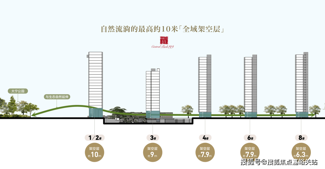 大胆创新最高约10米的全域架空层设计,将整个社区生活平面整体托举,打造出一座悬浮于空中的花园平台。