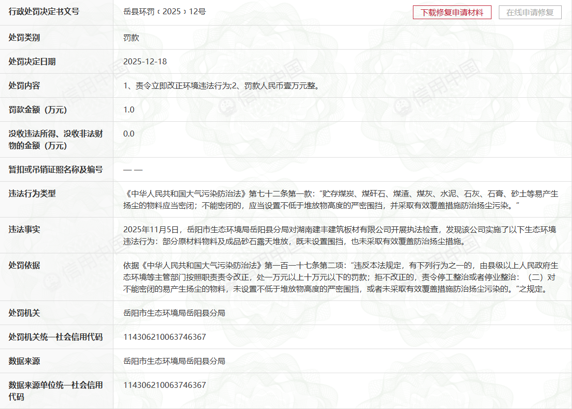 查看详情97国际-至尊品牌,源于信誉2025年12月18日,岳阳市生态环境局岳阳县分局正式作出岳县环罚〔2025〕12号行政处罚决定,湖南建丰建筑板材有限公司因违反...