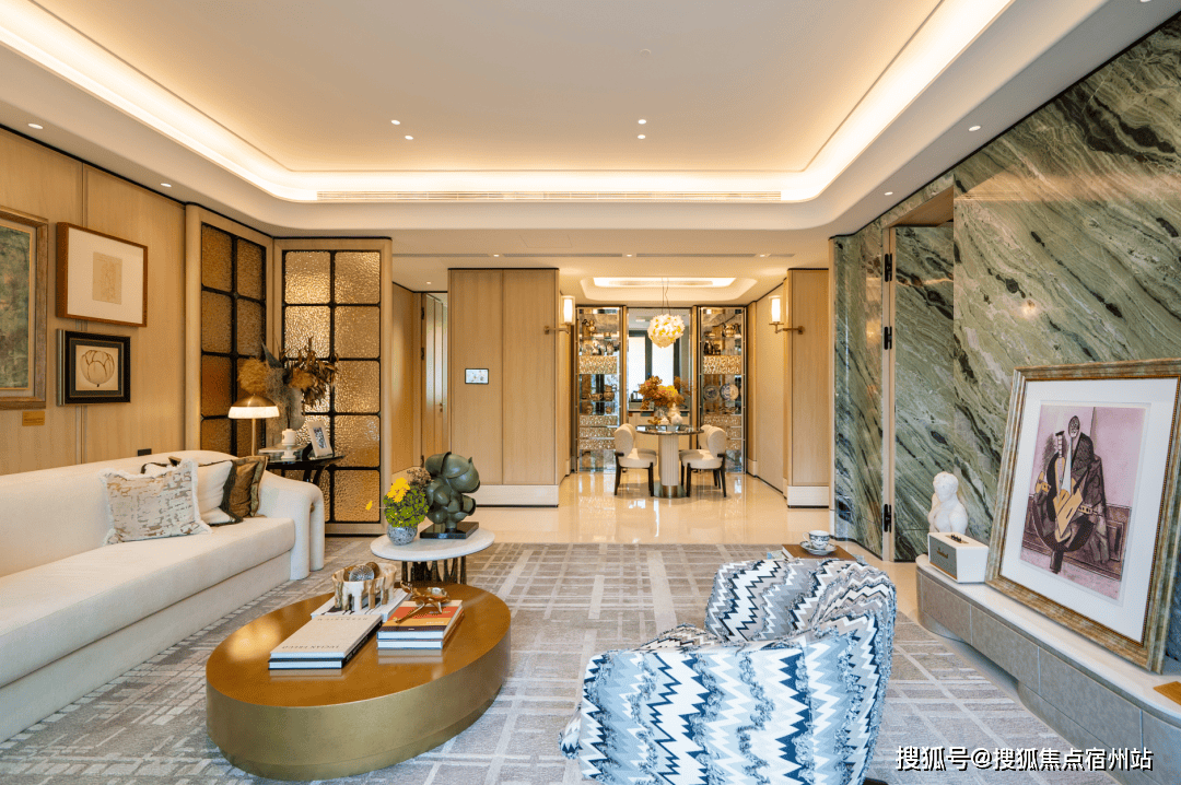 例如入户玄关铺设有“石材皇后”鱼肚印象,这种级别的奢石在很多顶豪项目中通常仅作局部镶嵌