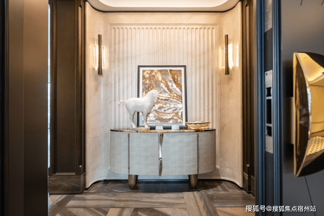 电梯厅的宠物识别按钮是艺术家定制款;入户门把手出自艺术家刘建华之手,用整块实心铜锭经锻造、打磨、电镀等多道精密工艺制成,握住的瞬间就是与艺术的触碰
