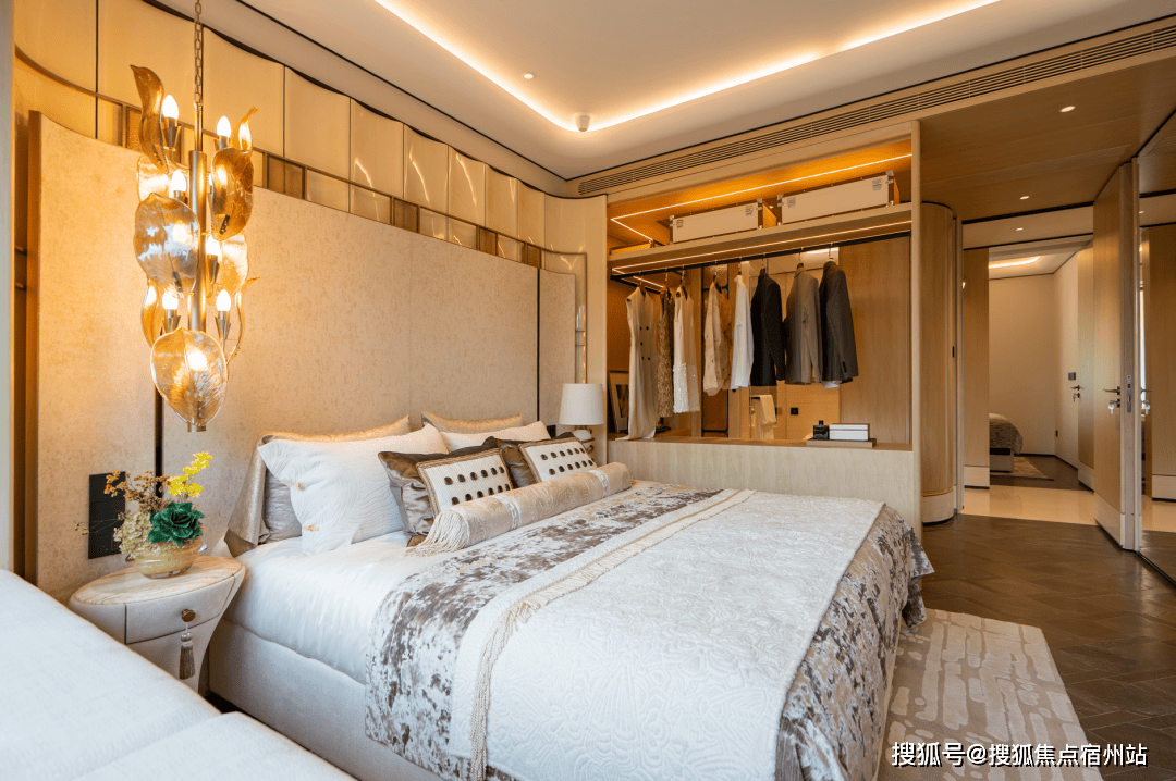这可能是我见过弧形元素更多的样板间,吊顶、客厅墙面及卧室背景墙均采用大量曲面处理,涵盖木饰面与奢石等多种材质弧形工艺,即便工序复杂且成本高昂,但绿城仍坚持落实,只为业主更高级的使用体验